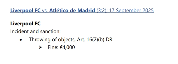 10月01日讯 欧冠首轮比赛,利物浦3-2战胜马竞。本场比赛中,利物浦因为球迷投掷物品,违反《欧足联纪律准则》第16(2)(b)条,俱乐部被罚款4000欧元。
